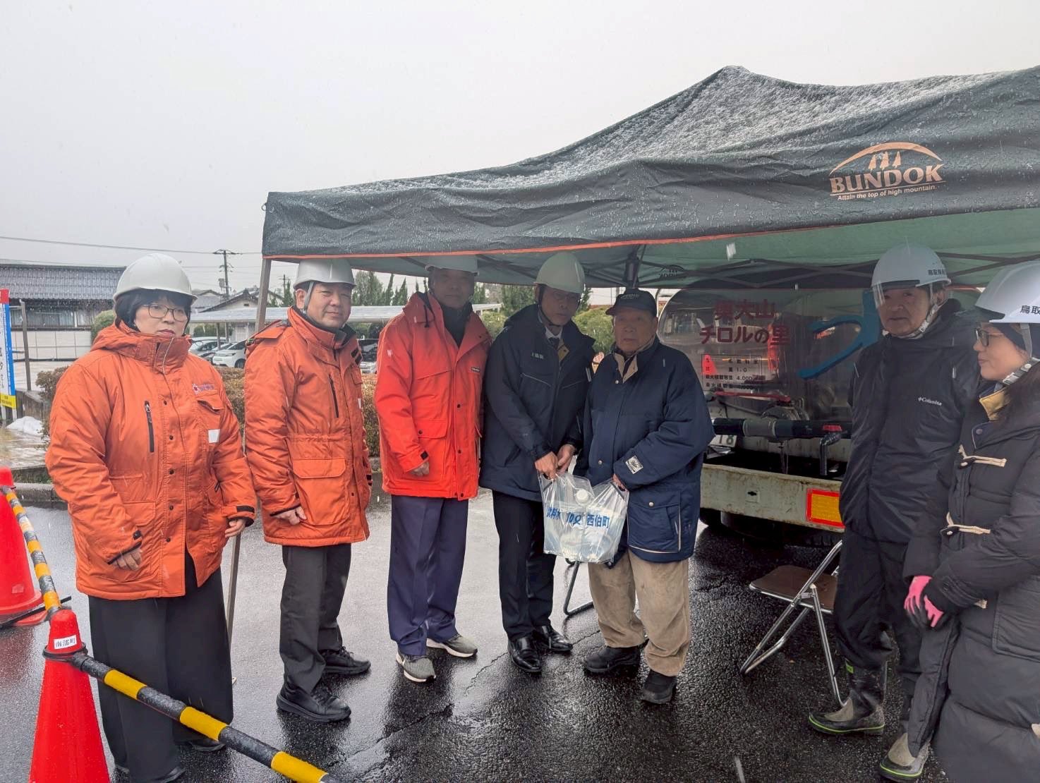 鳥取県南部町では、現在も約1100世帯が断水しているとのことです。庁舎で実施されている給水車による飲料水配布の様子を視察しました。